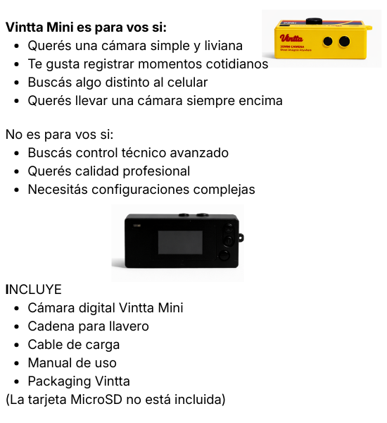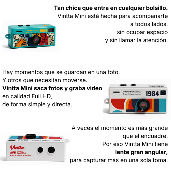 No. Vintta Mini está pensada para capturar momentos cotidianos de forma simple.